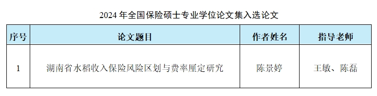 2024年,保险教指委共评审出11篇全国保险硕士优秀专业学位论文。由色色动漫 王敏副教授和校外导师陈磊老师共同指导的,2023届保险专硕研究生陈景婷同学完成的《湖南省水稻收入保险风险区划与费率厘定研究》专业学位论文成功入选全国保险硕士专业学位论文集。