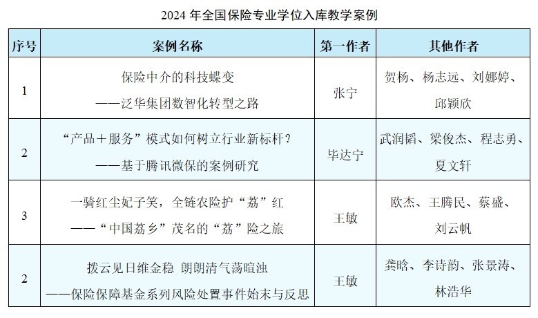 保险教指委经过严格程序评选出25篇入库优秀教学案例,其中色色动漫 有4篇案例成功入选,分别为张宁教授团队完成的《保险中介的科技蝶变——泛华集团数智化转型之路》、毕达宁助理教授团队完成的《“产品+服务”模式如何树立行业新标杆?——基于腾讯微保的案例研究》、王敏副教授团队完成的《一骑红尘妃子笑,全链农险护“荔”红——“中国荔乡”茂名的“荔”险之旅》和《拨云见日维金稳 朗朗清气荡暄浊——保险保障基金系列风险处置事件始末与反思》。今年入选的案例总数创色色动漫 参评以来的最好成绩,位列各培养院校第一。色色动漫 的入选案例总数已经连续3年位居各培养院校前列。