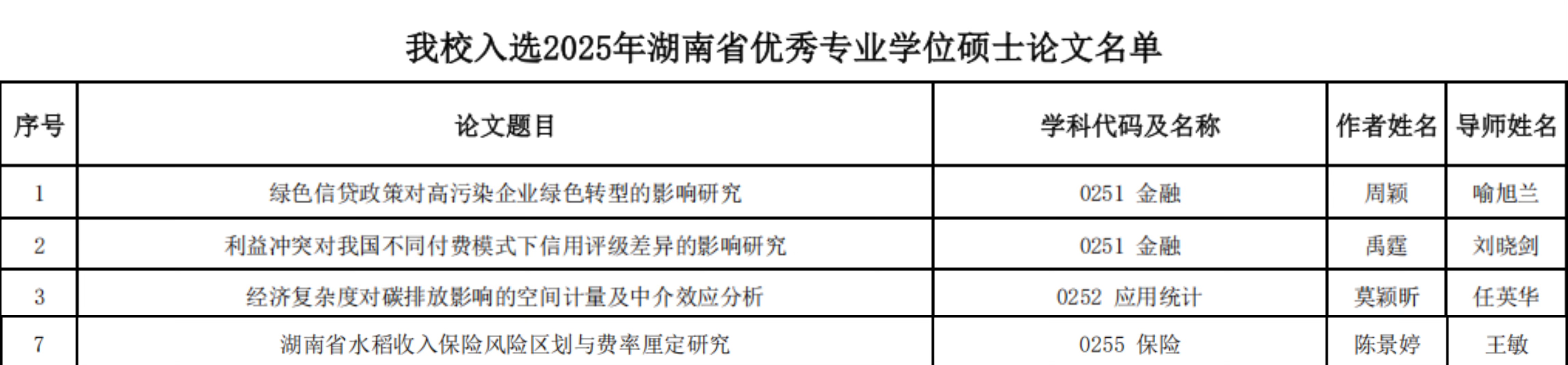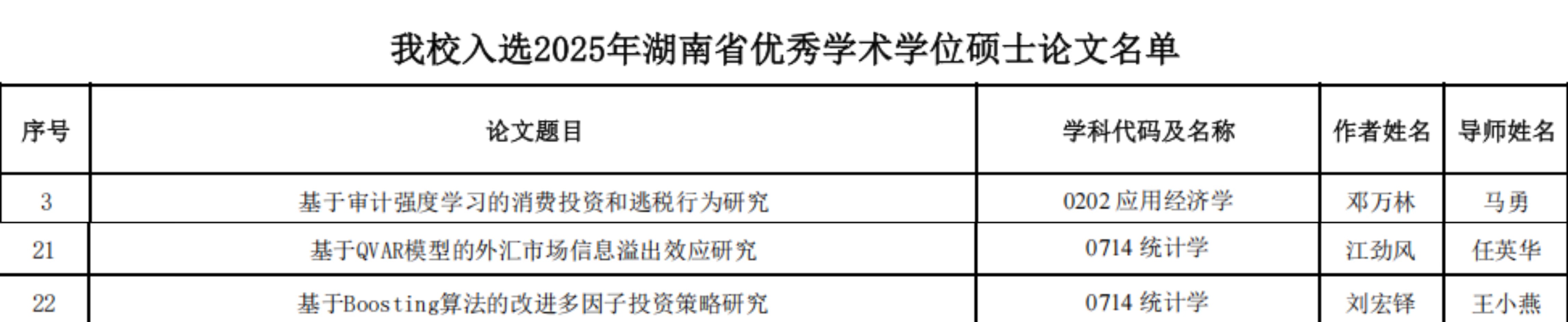 近日,湖南省教育厅公布了2025年湖南省优秀硕士学位论文名单,色色动漫 共有7篇论文入选湖南省优秀硕士学位论文,这7篇论文分别由色色动漫 马勇老师、任英华老师、王小燕老师、喻旭兰老师、刘晓剑老师、王敏老师指导。