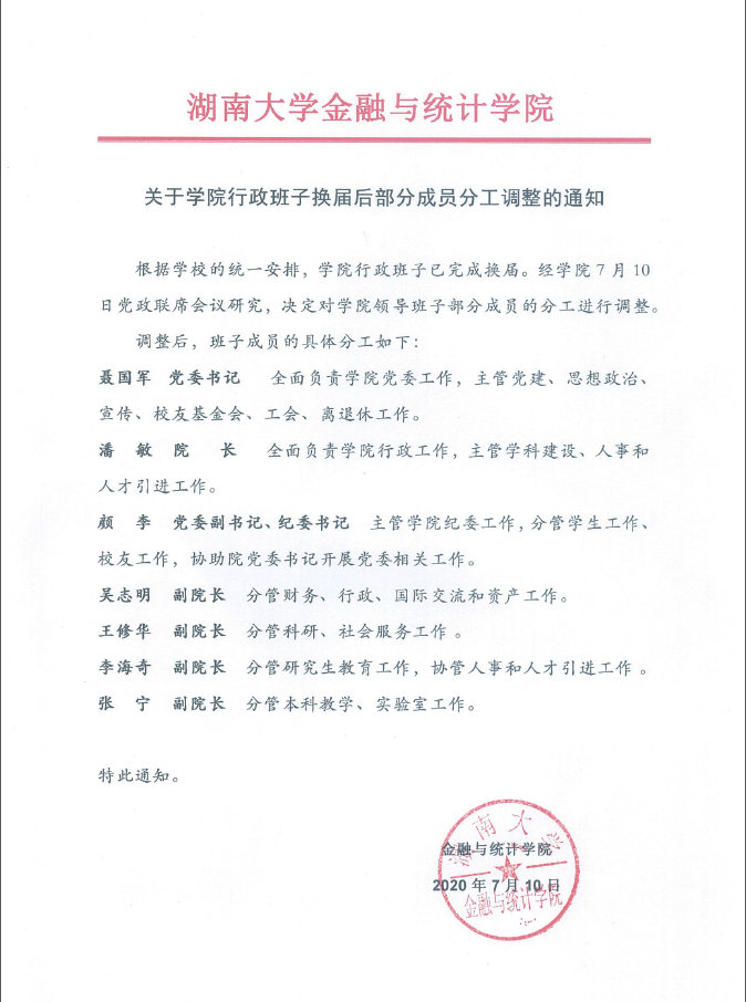 关于学院行政班子换届后部分成员分工调整的通知