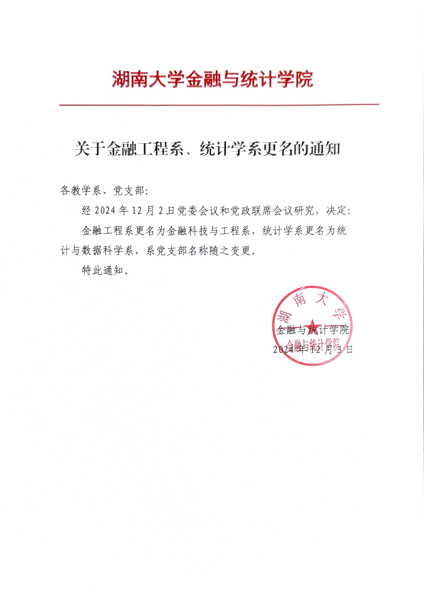 关于金融工程系、统计学系更名的通知